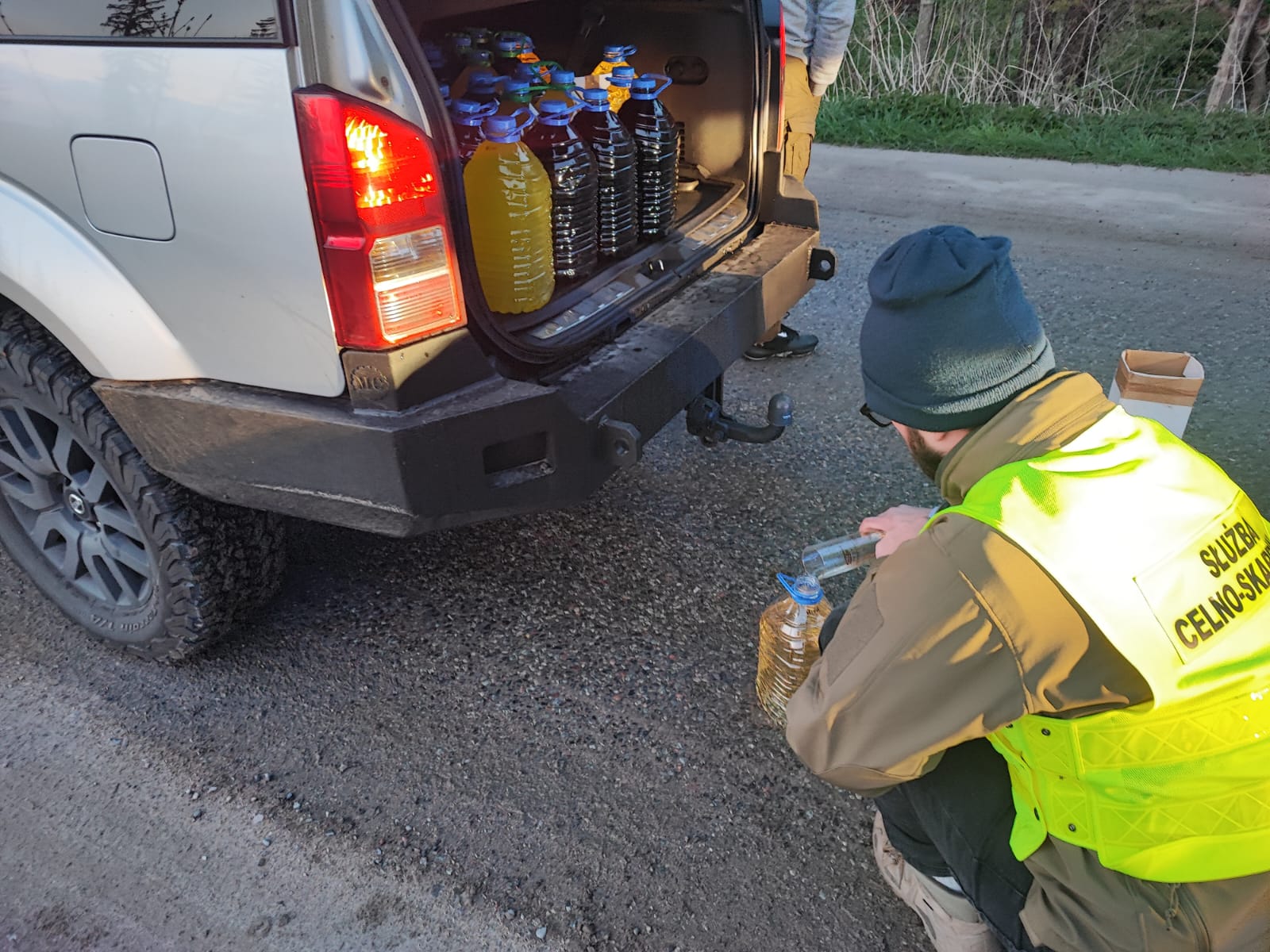 Nielegalny alkohol w bagażniku samochodu. Funkcjonariusz bada próbkę.