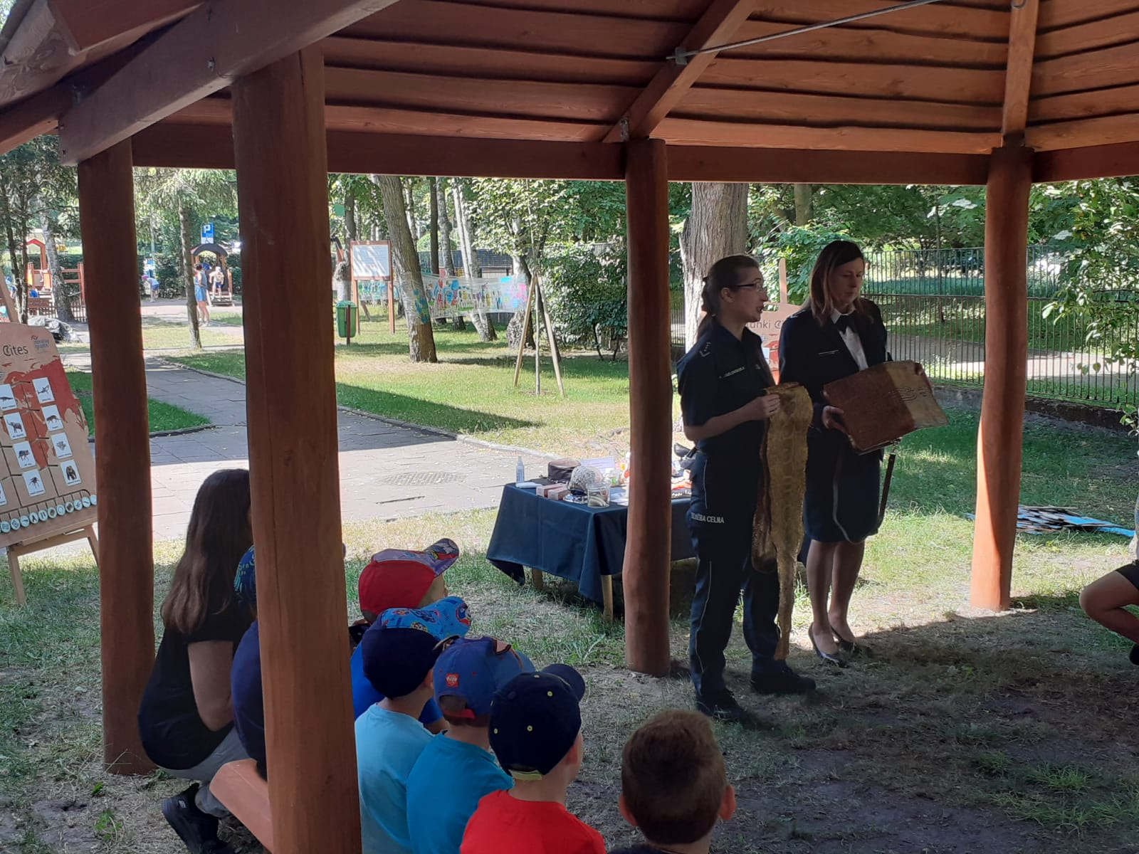 Spotkanie odbyło się na świeżym powietrzu, w otoczeniu przyrody – scenerii jak najbardziej sprzyjającej opowieściom o świecie zwierząt i roślin, które niestety przez działania człowieka mogą zniknąć z naszej planety. Dzieci mogły przyjrzeć się z bliska różnym okazom CITES, a także wziąć udział w przygotowanych dla nich grach i zabawach edukacyjnych. Zadaniem dzieci było m.in. odegranie scenki dotyczącej kontroli bagażu na lotnisku. Przedszkolaki do roli turysty powracającego z zagranicznych wakacji otrzymały rekwizyty w postaci walizki i torby z różną zawartością. Zadaniem pozostałych przedszkolaków-turystów było rozpoznanie, które przedmioty mogą być pamiątką z wakacji, a których nie należy przywozić. Mali aktorzy poradzili sobie wspaniale.